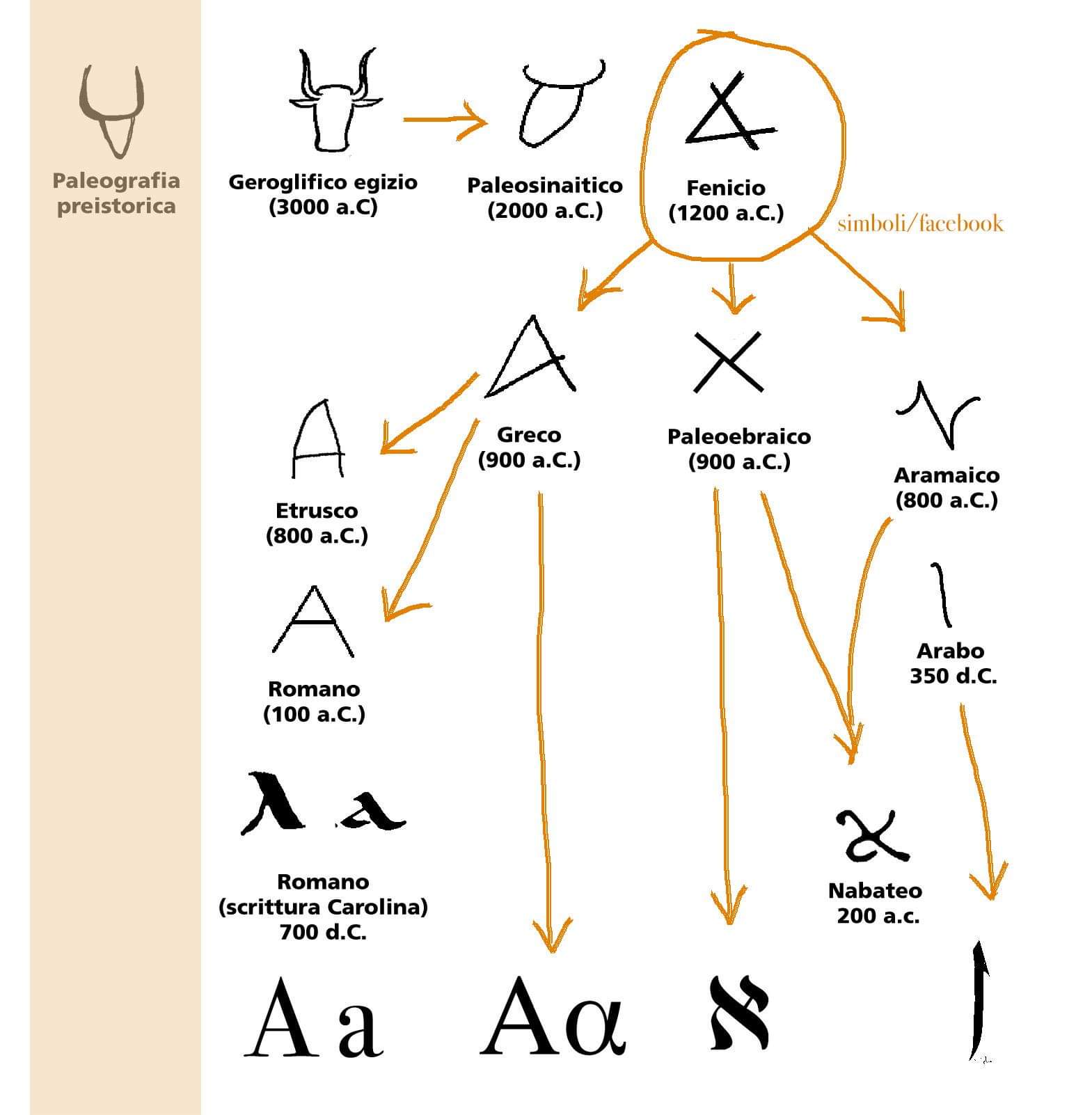 Una piccola curiosità: Si dice che la Aleph dei fenici fosse una a maiuscola che i romani hanno “raddrizzato”. La maestosa A maiuscola dei caratteri lapidari romani è certo un perfezionamento dell’alpha dei greci, resa imponente se scolpita nel travertino. Ma la scrittura Carolina (quella che inventò la differenza tra maiuscolo e minuscolo) nella sua a minuscola mantiene una perfetta corrispondenza con l’Aleph originario. La storia nasconde ma non perde.” (Via Simboli)